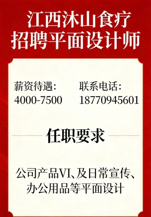 企业名称:江西沐山食疗科技有限公司招聘岗位:平面设计师人 数:2人...