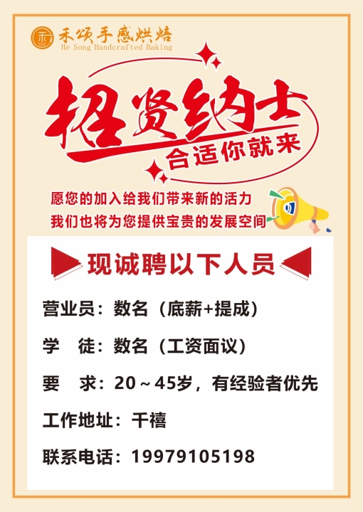 招烘焙店营业员,上班时间6.30~14.30,14.30~23.00两班倒...