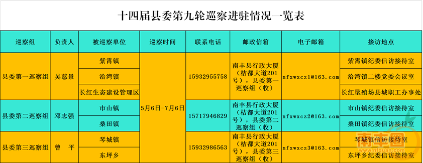 根据南丰县委统一部署,十四届县委第九轮巡察安排3个巡察组,分别对紫霄镇、洽湾镇、长红生态建设管理区、市山镇、桑田镇、琴城镇、东坪乡7个单位党组织及其成员开展常规巡察。巡察时间为5月6日至7月6日,截止目前已全部进驻完毕。