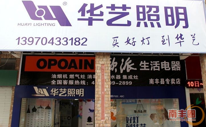 华艺照明南丰店座落于琴湖御景建材城10栋8-9号店,主营灯具浴霸,开关插座,客厅灯、卧室灯、餐厅灯、吸顶灯、吊灯、台灯,各种水晶灯、欧美灯、家居照明灯等。样式齐全,满足你的各种需求!