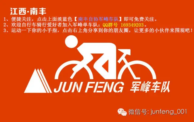 南丰军峰单车队真诚欢迎南丰广大单车爱好者加入!军峰单车队QQ群号:169349203、我个人QQ:287421991,加群(加个人QQ)请注明车友!