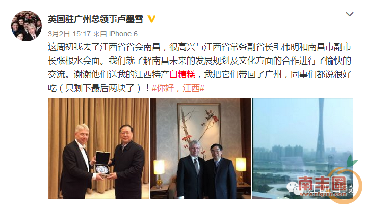 3月2日,英国驻广州总领事卢墨雪发布微博称,“这周初我去了江西省省会南昌,很高兴与江西省常务副省长毛伟明和南昌市副市长张根水会面……谢谢他们送我的江西特产白糖糕,我把它们带回了广州,同事们都说很好吃(只剩下最后两块了)!”江西特色小吃很多,来一次不够!