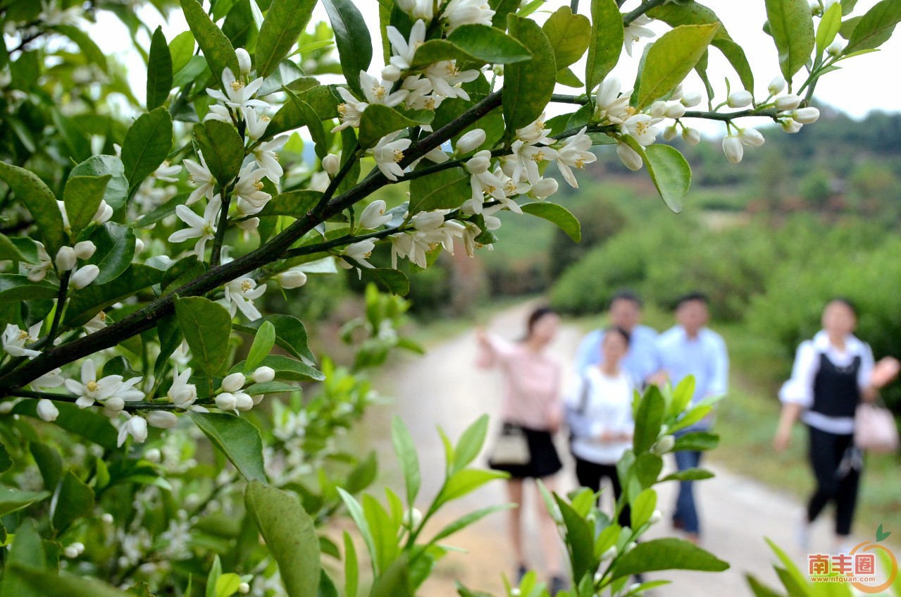 说明:春天里,南丰县70亩蜜橘树绽放洁白的橘花,满城淡雅的花香味吸引四面八方的游客前来踏青游玩闻香。