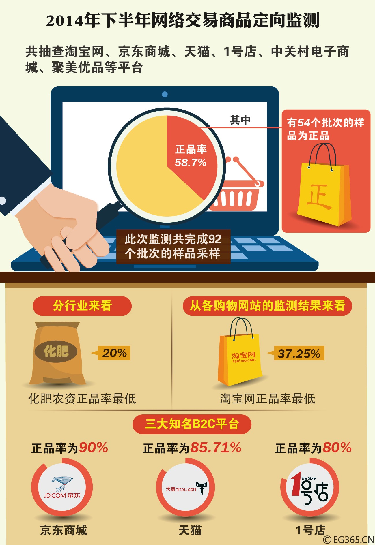 网购商品监测结果显示,所有抽取的92件样品中有38件样品是非正品,存在假冒伪劣、翻新、产品含量与宣传不符、无3C认证、非授权正规渠道销售等问题。销售非正品的网站涉及京东、淘宝、天猫、1号店、中关村电子商城。淘宝网分布样本数量最多,正品率最低,51件样品中有32件非正品,正品率仅为37.25%。目前,国家工商总局已对相关违法经营者和第三方网络交易平台经营者进行依法查处。